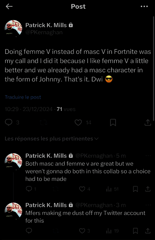 对此,游戏的高级人物设计师 Patrick Mills 特意找回在“吃灰”的推特(X)账号,回应了玩家:“我个人更喜欢女性版本的 V,而且我们已经有了强尼作为男性角色。”这也并不是说 CDPR 整体都偏爱女版 V。实际上 Mills 透露,男女 V 都很棒,但是这次联动没法把他们两个都放进去,因此他必须做出选择。