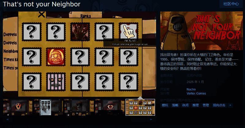 今日(12月27日),原itch.io平台类请出示证件游戏《That's not your Neighbor》将于2025年1月在Steam推出,该作支持简体中文,感兴趣的玩家可以点击此处进入商店页面。