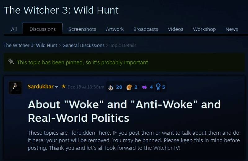 近日《巫师3》Steam社区里出现置顶帖,一位版主禁止大家讨论“觉醒”“反觉醒”和现实政治。