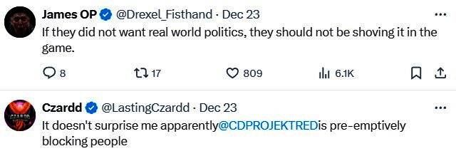 该禁令出现,是因为有人批评《巫师4》希里的角色设计,认为CDPR让她成为了一个丑陋普通的妇女等等。结果他被禁言,理由是“仇恨、厌恶女人,辱骂谩骂”等等。