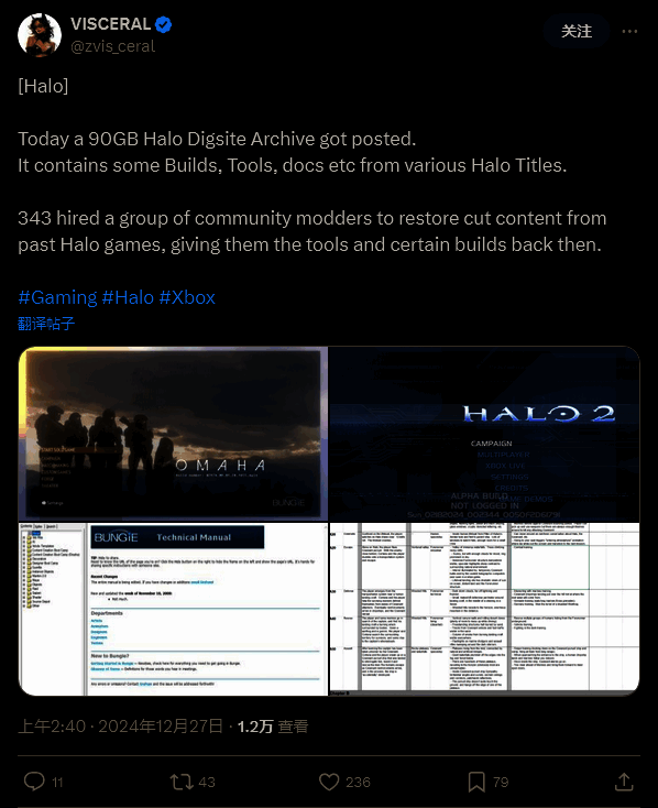 消息泄露账号 VISCERAL 首先分享了此次泄露,称其包含月 90GB 的数据,据称这来自 343 Industries 雇佣的一群试图恢复老游戏中被删减的内容和数据的 Mod 制作者。该项目被称为 Digsite,一些了解该项目,包括一名曾参与该项目的的 Mod 制作者确认了此次泄露的真实性。