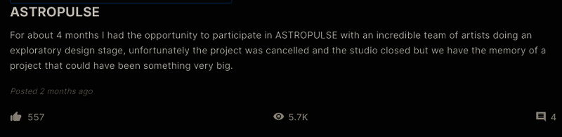 这位艺术家写道:“在大约 4 个月的时间里,我有机会与一支令人难以置信的艺术家团队一起参与《ASTROPULSE》的探索性设计阶段,不幸的是该项目被取消,工作室关闭,但我们记得这个项目本来可以是非常大的作品。”