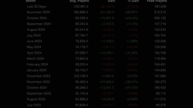 《黑色行动6》于 10 月 25 日发售,至今已经过去两个月。可以看到前两个月玩家人数上升非常多,11 月增加了 96.67%。虽然这似乎以往作品也会有类似的下降,但今年的新作比以往作品下降似乎更加严重。