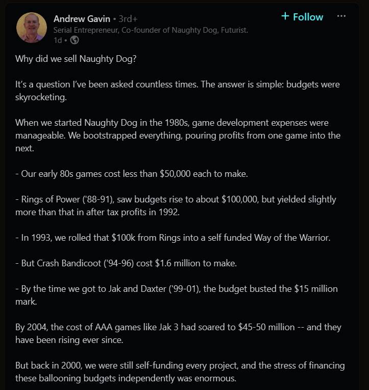 Andrew Gavin在LinkedIn上发文,解释了为什么顽皮狗在90年代发展良好,却还是卖给了索尼。他说21世纪初的游戏开发成本猛涨,顽皮狗已无法负担高额预算。他举例说,《古惑狼》系列开发成本在94年-96年期间已超100万美元,而《杰克与达斯特》开发成本更是攀升至1500万美元。