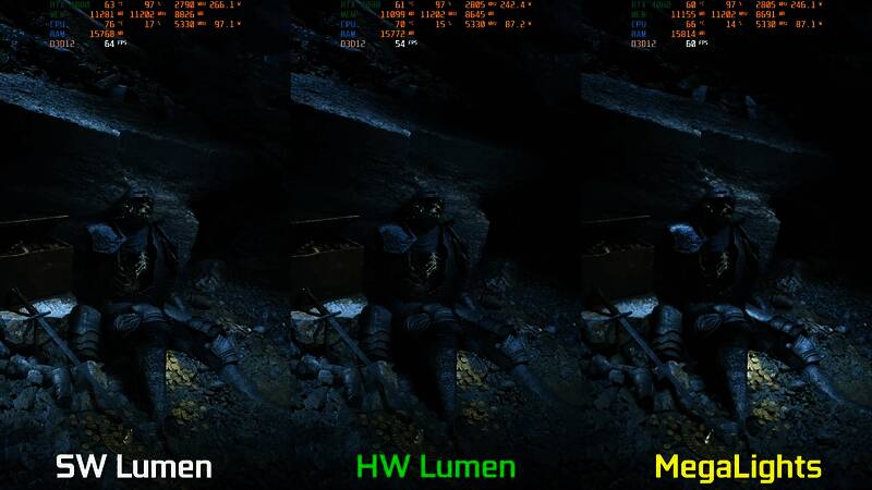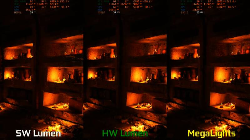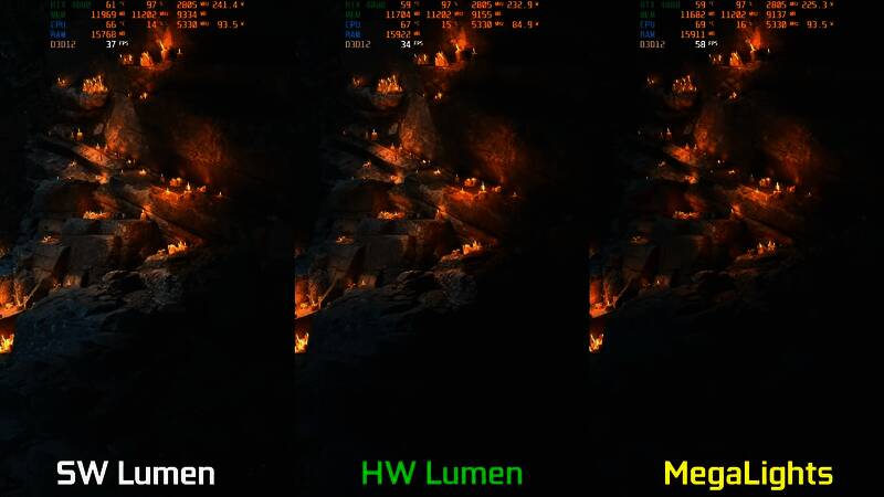 MegaLights技术是虚幻引擎5.5版新功能,其允许使用大量的区域照明和光线追踪阴影,并能保持良好的性能优化。油管主MxBenchmarkPC将MegaLights版本与软/硬件Lumen版本进行了对比。可以看到,MegaLights版本性能提升达50%,在不损失画质情况下,显著提高了帧率表现。