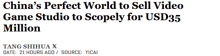 日前据外媒报道,知名中国游戏商完美世界卖掉了旗下成锋工作室,新的主人是知名美国工作室Scopely,交易额约3500万美金。
