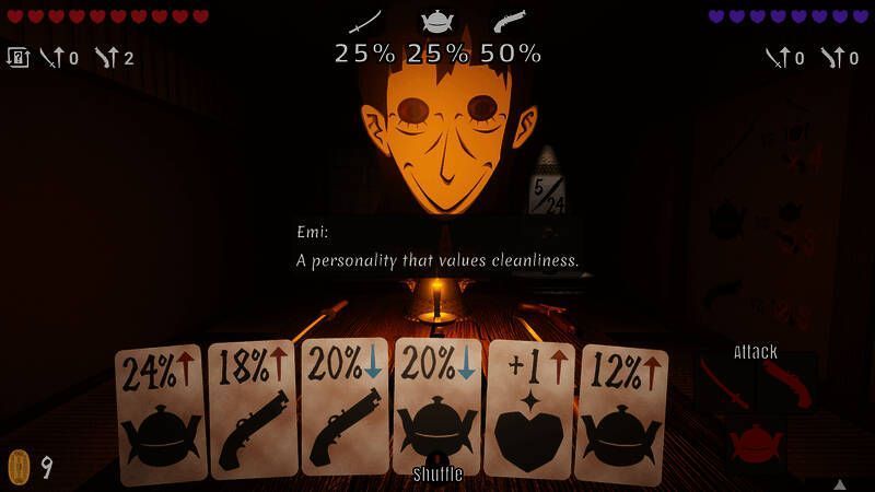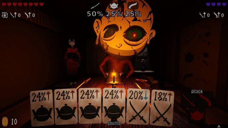 本作是一款只需用鼠标即可游玩的休闲回合制策略恐怖游戏。武士刀克火绳枪。兜甲克武士刀。火绳枪克兜甲。怪物的行动通过卡牌来控制。祝你好运,逃出“J-Room”。