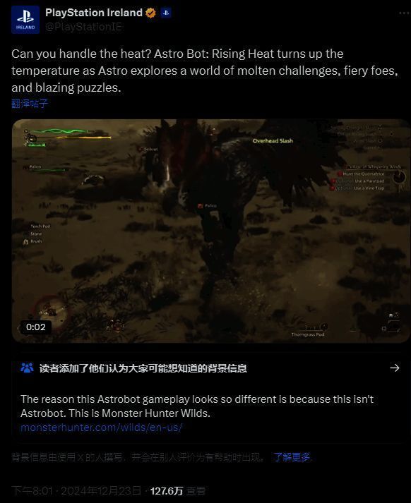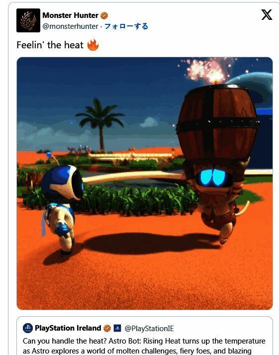 日前,PS爱尔兰的官方X发布了一则推文引发热议,原本是推广介绍《宇宙机器人》,没想到发布的视频却是《怪物猎人:荒野》,引发玩家困惑,而且截止本文发稿仍然没改换,玩家纷纷表示实在难以找到两个游戏的相似共鸣之处。