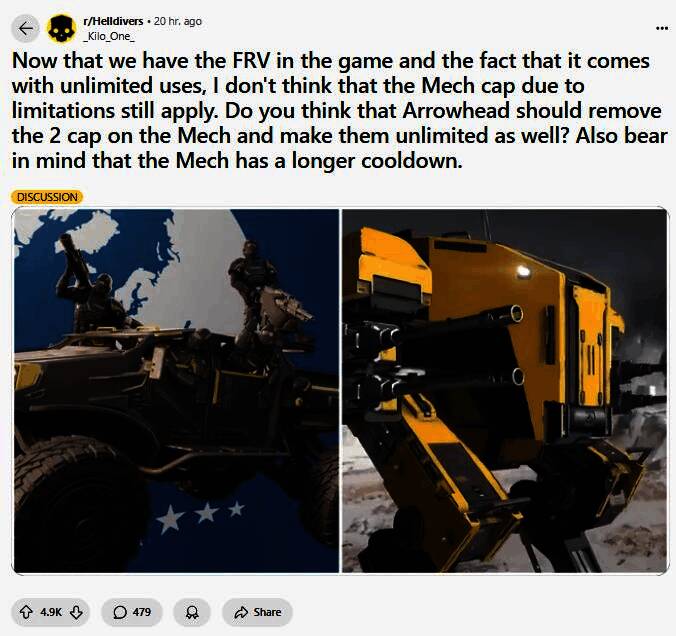 这一新增的优点虽然大大提高了玩家的游戏体验,也令部分玩家感到不平衡,因为同样属于游戏中载具位置的机甲,此前都有着召唤上限。虽然机甲载具都有着强大的输出能力(但有弹药上限),但机甲往往也十分脆弱,有玩家调侃甚至“比潜兵还要脆弱”,有时候也会在空投的过程中爆炸,导致玩家无法使用(因为一局游戏仅能呼叫一次机甲)。