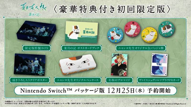 Switch 版的标准实体版/数字版售价为7480日元,初回限定版售价为12980日元。后者包括特制包装、一张A3尺寸的原创透明海报、一个猫咪老师原创铅笔盒、四个猫咪老师原创徽章、一本夏目友人帐明信片册、一张名取修一照片纸写真和一张宣传卡。