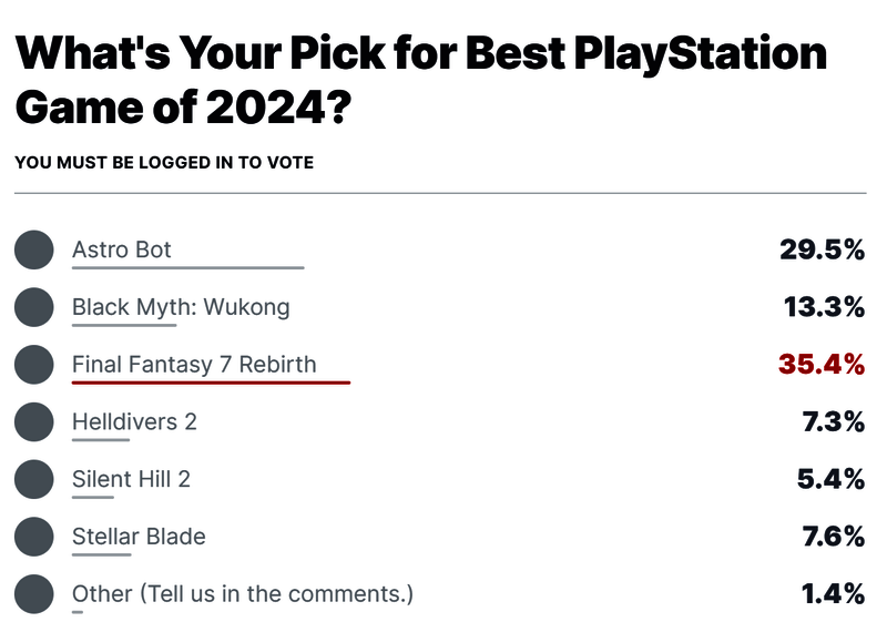 提名的游戏还包括《黑神话:悟空》、《最终幻想7:重生》、《绝地潜者2》、《寂静岭2:重制版》、《剑星》。其中,《最终幻想7:重生》以35.4%的得票率获得玩家排行榜首。