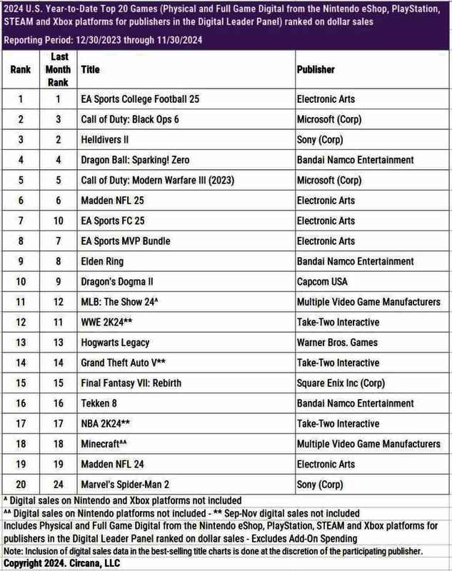 统计机构Circana发布了2024年至今美国国内最挣钱的20大游戏,统计包含了实体版和来自任天堂eShop、PlayStation、Steam和Xbox平台的数字销量排行,按照美元收益统计排名。时间是从2023年12月30日至2024年11月30日。