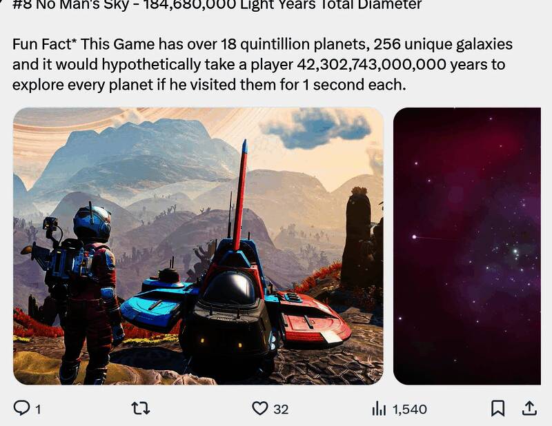 这个游戏中有超过18千万亿个行星、256个独特的星系,假设玩家在每个行星上访问1秒钟,则需要 42302743000000年才能探索完。