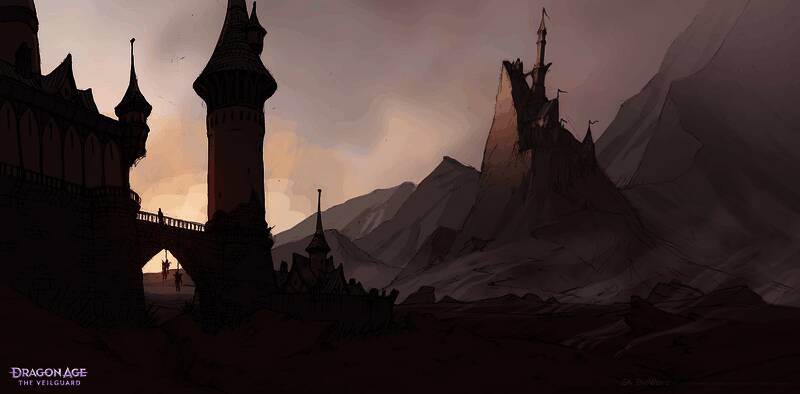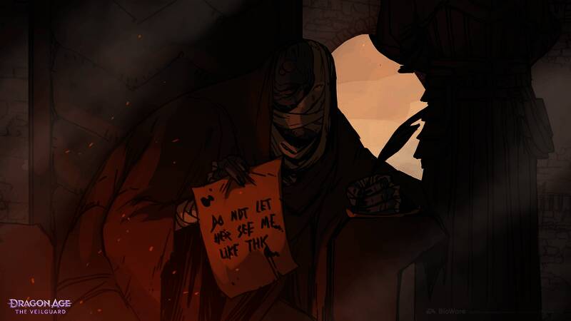 罗兹分享了几张关于赛达斯大陆安德尔费尔斯地区的概念图,那里是守护者的雪顶要塞以及《影障守护者》中霍斯伯格湿地区域的所在地。第三张图着实令人震惊,图中展示了一个裹着绷带的披风身影,其裸露在外的皮肤呈斑驳的紫灰色。此人坐在王座上,身后站着一名守护者保镖,而且这个角色似乎已经无法说话了,只能依靠羽毛笔和一沓羊皮纸来与人交流。他正拿着这样一张纸条面向观者,上面写着:“别让她看到我这个样子。”