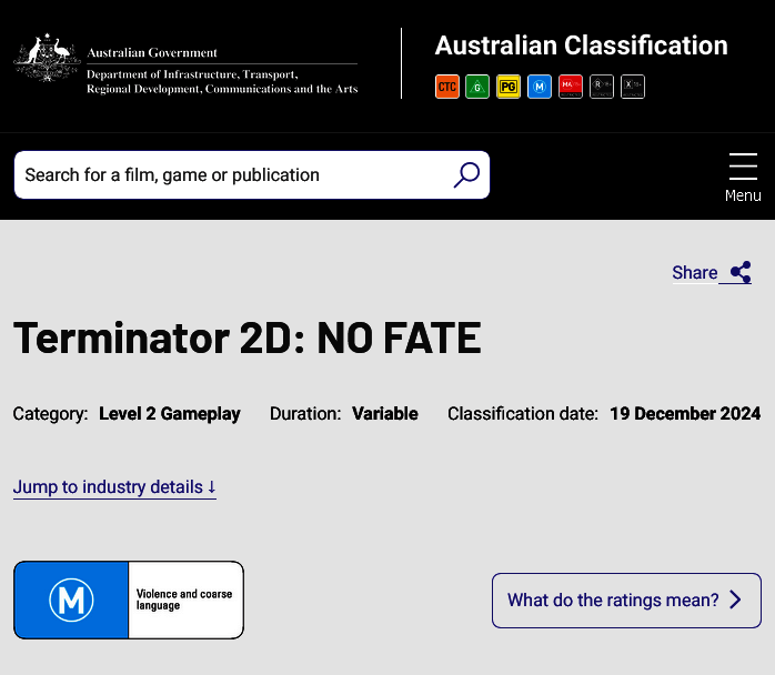 澳大利亚分级机构日前已对计划在 PS5、PS4、Xbox Series、Xbox One、任天堂 Switch 和 PC 上发布的游戏《终结者2D:NO FATE》仅凭了评级。