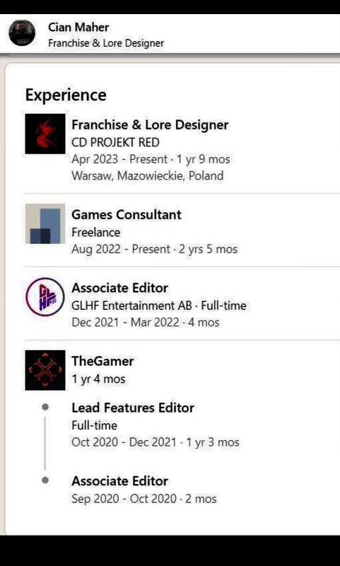 根据其领英简历,Cian Maher曾在游戏媒体The Gamer担任过编辑(2020年10月),任职一年四个月,2022年以“自由职业者”身份担任“游戏顾问”,2023年4月加盟了CDPR,持续到至今。