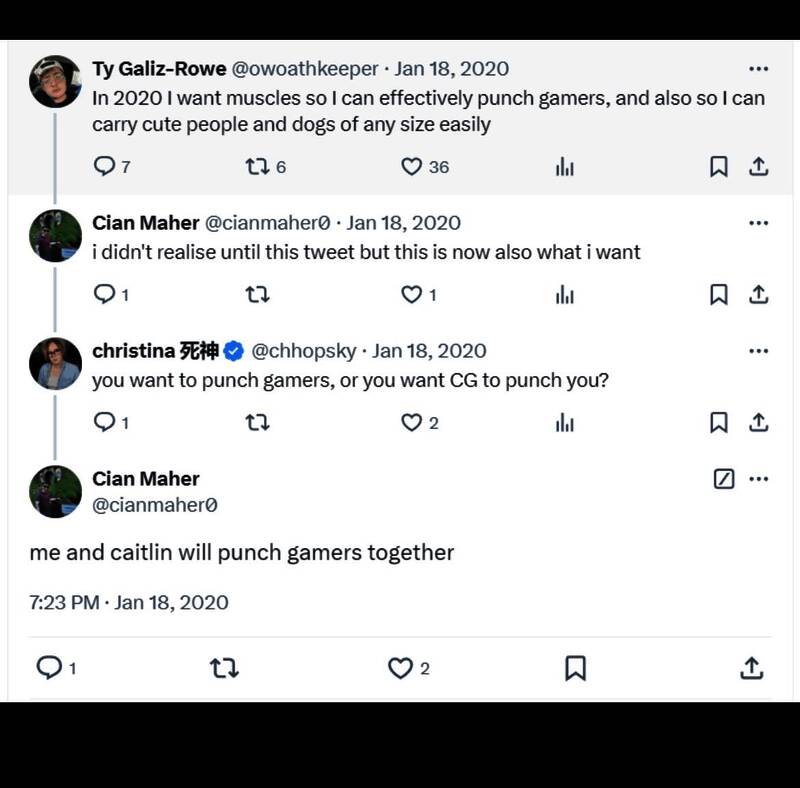 2020年1月,一名用户说他想要有肌肉,这样就能揍玩家,Cian Maher回应了这名玩家说,“这也是我想要的”,随后在同年10月加入了游戏媒体The Gamer。
