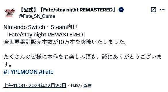 12月20日,发行商Aniplex和开发商TYPE-MOON宣布,奇幻动作视觉小说《Fate/stay night复刻版》全球销量已突破10万份,该作于2024年8月7日登陆了Switch和Steam,支持中文,目前Steam玩家评测好评率高达95%“好评如潮”。