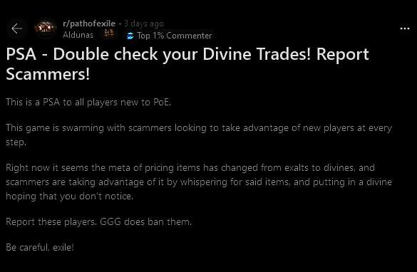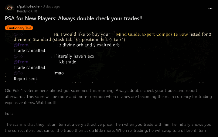 在 Reddit 论坛《流放之路2》分版上,一位老玩家提醒随着新作推出而来的大量新玩家,这些从第一部游戏里就存在的骗子会骗走玩家辛辛苦苦刷了半天攒下的“积蓄”,或是运气好掉落的装备。帖子写道:“仔细检查你的神圣石(游戏中又来交易和洗点的货币之一)交易,并积极举报骗子。”