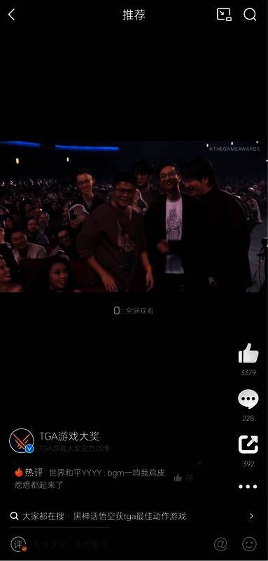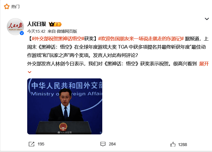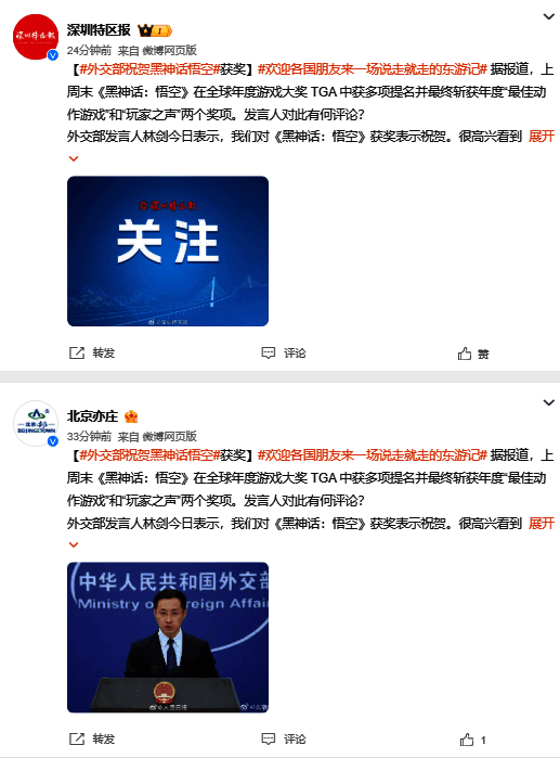 18日外交部发言人对黑神话表示祝贺的新闻后,微博上更是有大量地方政务号纷纷跟进,让TGA的名字跟随黑神话一起从核心游戏圈扩散到全国各地区,真正实现了国民级的传播。