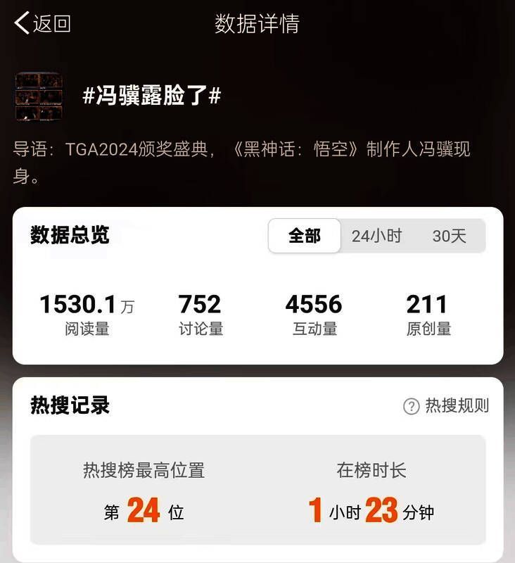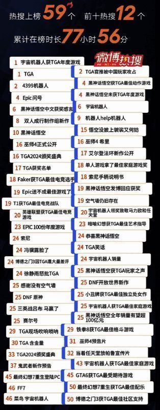 一方面,由于玩家对入围多项提名的黑神话抱得大奖寄予厚望,TGA在微博的关注度超越往年并在13日达到巅峰,当天的颁奖礼直播也始终霸屏热搜。根据微博官方发布的数据显示,截至14日0点,围绕这场颁奖礼,共产生59个热搜登榜,其中有12个话题占据前十位置。