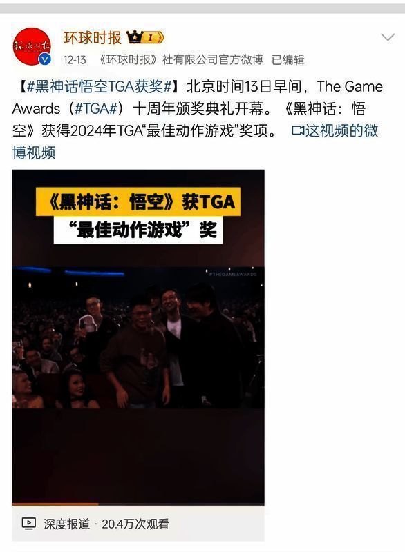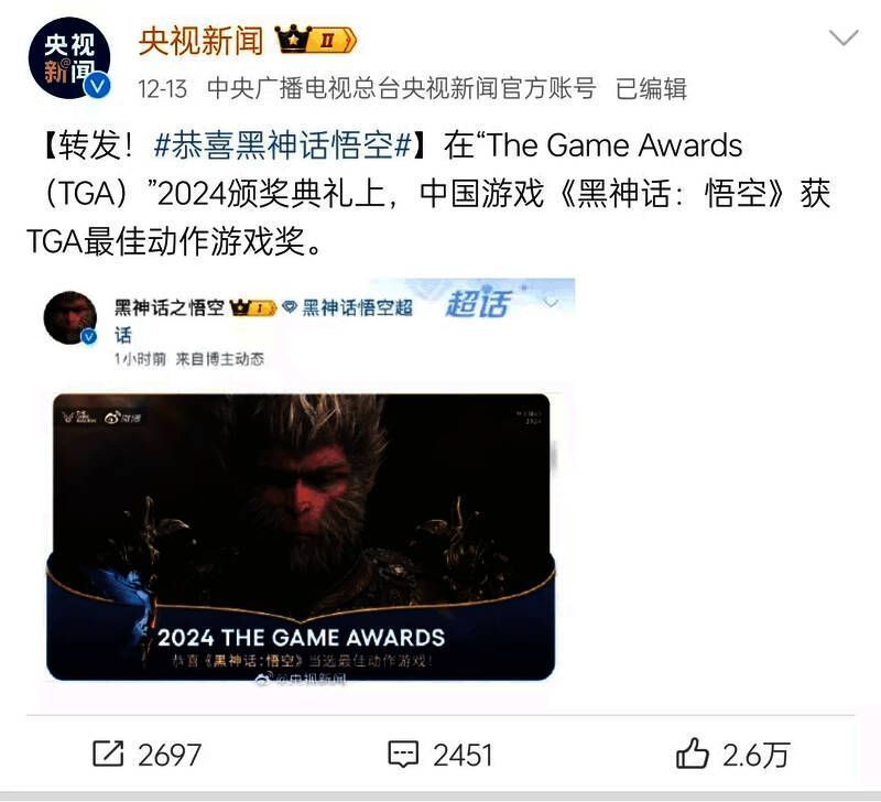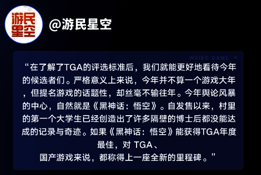 进一步让本届TGA与往年不同的,则是主流媒体的深度参与。黑神话在中华文化传播、地方文旅宣传、周边产业带动性等层面表现出的积极成绩,早已获得社会各界认可。此次黑神话获奖,央视新闻、人民日报、环球时报、观察者网等官方媒体均在微博发布相关讯息,报道黑神话获奖信息。国产游戏享受如此高规格媒体待遇可谓前所未有,既让黑神话在主流舆论的口碑进一步提升,也从侧面为TGA奖项含金量形成背书。