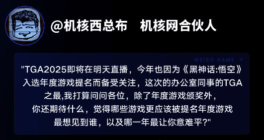 实际上,这一结果也离不开奖项主办方提前积极布局中文社交媒体。出于对黑神话为代表的中国游戏产品的肯定和对中国广阔游戏市场的重视,今年TGA官方在中文互联网上迈出了重大一步:与中国最大的中文社交媒体平台微博展开合作,共同开设微博投票通道。围绕这一合作,TGA游戏大奖官方也在微博开设官方账号。这背后传递出的信号相当清晰:中国庞大的玩家消费群体,正成为全球游戏产业无法忽视的评价主体。