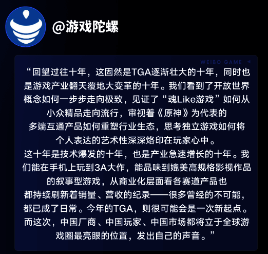 同时,在社交媒体平台微博上活跃的大量媒体,也为此次TGA的声势注入了大量权威、专业的声音。