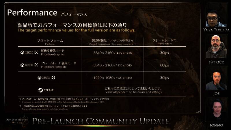 性能方面,公开了各主机和 PC 的目标值。此外,还透露将在发售当天发布的 Day1 补丁中支持“PS5 Pro Enhanced”,并为 PC 版准备了基准测试软件。