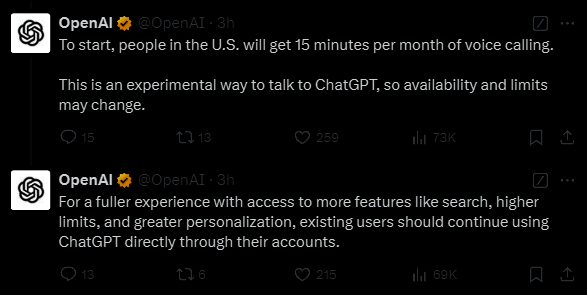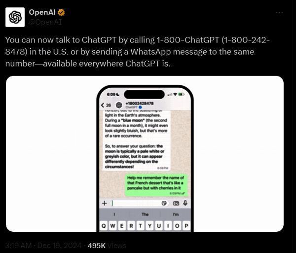 OpenAI首席产品官表示:“我们的使命是让通用人工智能造福全人类,部分目标就是尽可能让它向更多人开放。今天,我们迈出了下一步,把ChatGPT带到电话上。”