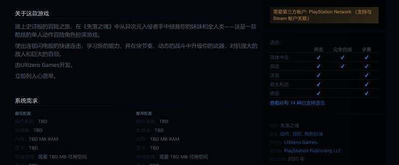 根据Steam页面,《失落之魂》支持简体中文和中文配音,同时需要关联第三方账户PSN,支持手柄操作。
