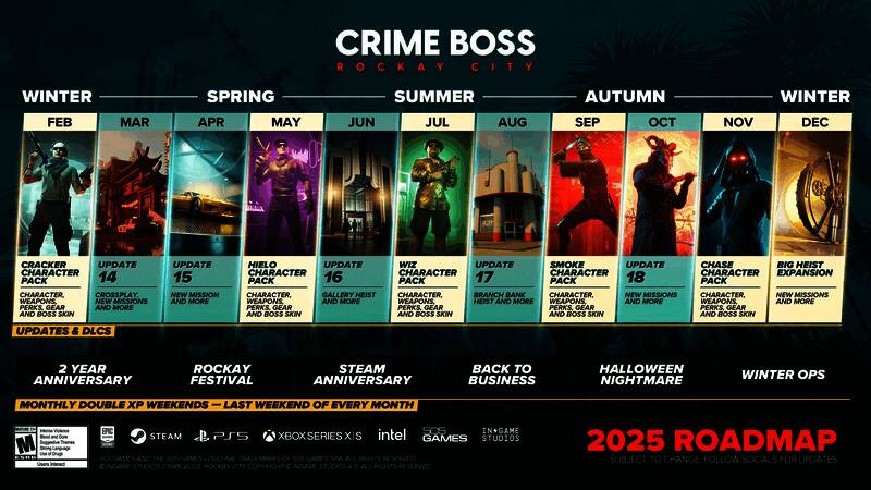 据了解《法外枭雄:滚石城》将在2025年期间推出全新任务、新故事情节、新DLC,以及最重要的抢劫内容。从放出的路线图可以看到,自2025年2月起,每个月都会有一次重要内容推出,例如二月推出的新角色“克拉克角色包”。