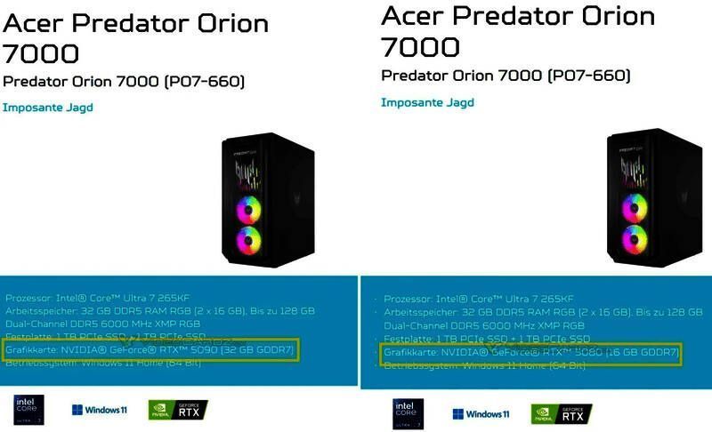 Acer Predator Orion 7000系列台式机泄露广告确认,即将发布的RTX 5080和RTX 5090显卡分别搭载16GB和32GB GDDR7显存。RTX 5080将有10752个CUDA核心,而RTX 5090有21760个CUDA核心。这两款高端旗舰都支持新的AI技术,强化性能表现。