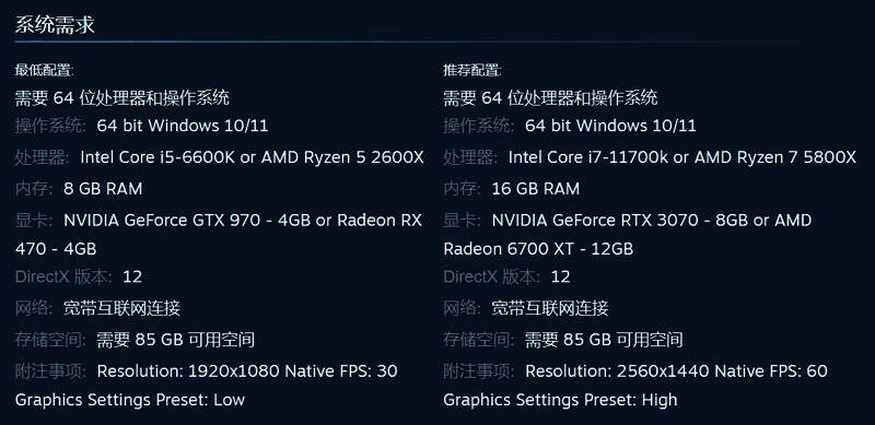 对于在1440p/高画质下以60FPS进行游戏,开发者给出的推荐位置为Intel Core i7-11700k或AMD Ryzen 7 5800X处理器,搭配16GB内存和NVIDIA GeForce RTX 3070或AMD Radeon 6700 XT显卡。游戏还需要85GB的可用磁盘空间。