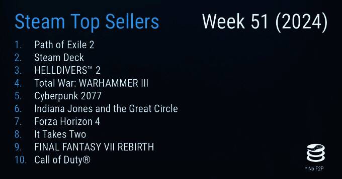 Steam最新一周销量榜出炉(2024年12月10日-2024年12月17日),本周《流放之路2》再次登顶,达成二连冠,即将登陆Steam并开启预购的《最终幻想7:重生》也登上了榜单。