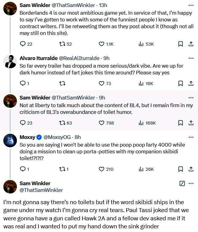 《无主之地3》因充斥着大量的屎尿屁笑话而备受批评。近日Winkler在回应粉丝时说:“我不方便过多谈论《无主之地4》,但我仍坚决认为《无主之地3》厕所幽默过多。我不是说游戏中不能有屎尿屁笑话,但如果‘马桶人(skibidi)’这个词出现在我的游戏里,我会真的哭了。”
