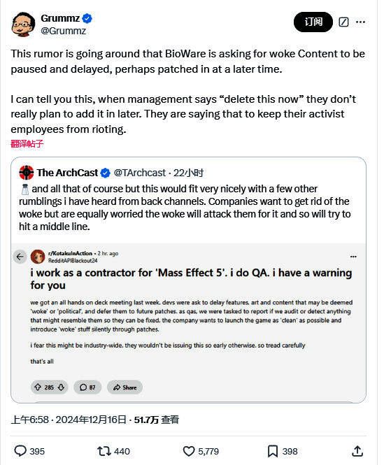 以上消息来自于Reddit上一名自称是合同工的《质量效应》QA测试员。推主The ArchCast转发了这条消息,同时他也表示自己也有听到类似的传闻。他认为大公司们如今也想摆脱woke,但同时也担心被woke人士攻击,因此可能会采取折中路线。