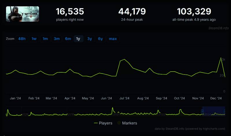 在《巫师4》首个预告片于TGA 2024上公布后,前作《巫师3》Steam同时在线玩家数量在近日创造了新高,达到了44,179人,这也是今年的最高值。上一次出现这样的人数变化还是在2022年末,《巫师3》次世代更新上线时。