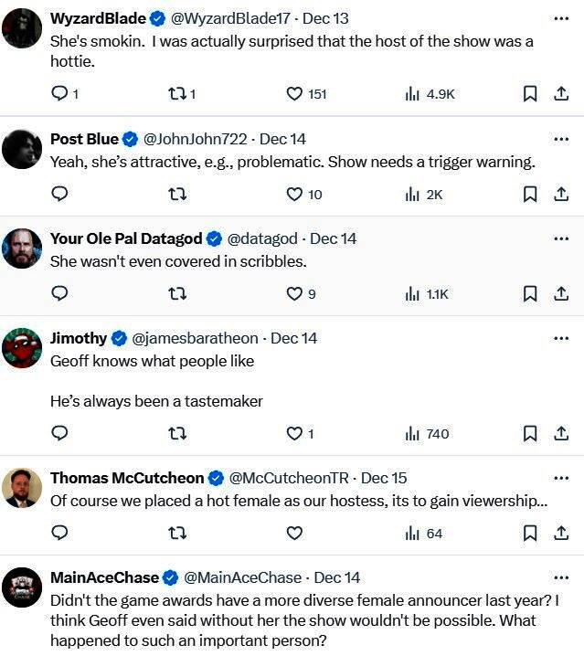评论区有许多网友表示:“她真火辣性感,希望下一届颁奖典礼还能见到她”“此次TGA的女主持人更具代表性”“主持人是个辣妹”“当然,安排一个性感女主持人,是为了增加收视率”“她引起了我的注意!”