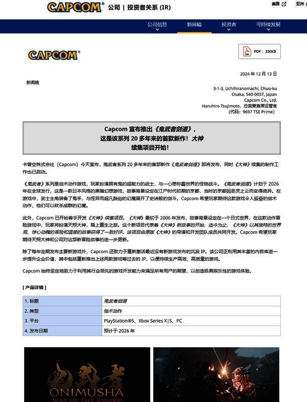 在Capcom官网发布的题为“隆重公布《鬼武者:剑之道》,系列20多年首个新作!《大神》续作的开发已经开始”的新闻稿中,Capcom表示:“除了每年定期发售大型新作外,公司还在专注于重新激活那些已经很长时间没有推出新作的休眠IP。公司正利用其丰富的内容库进一步提升企业价值,其中包括重新推出上述两款游戏等过去的IP,以便持续生产高效、高质量的游戏。”