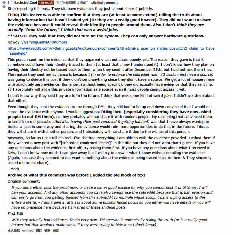 目前,NintendoSwitch2版主已经发布通知告知网友不要再举报该贴文,也不要私信爆料人讨要Switch 2的图片,爆料人会按照承诺在圣诞节公布证据。