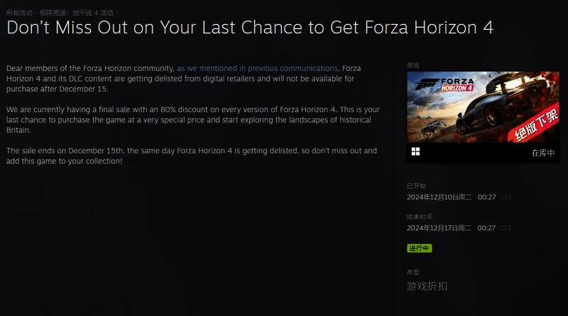 此前官方曾表示游戏将于2024年12月15日全面下架并停止销售,目前《极限竞速:地平线4》的DLC内容已在2024年6月26日停售(目前仅有可免费领取的三菱车包显示可用),但本体标准版及豪华版和终极版仍在Steam平台促销中,将于7个小时后到期(届时游戏也将彻底下架),Steam平台国区本体现价37.6元。