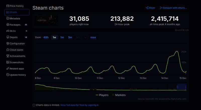 以上种种因素导致《黑神话:悟空》Steam在线活跃起来,24小时在线重回20万量级(24小时在线峰值21.3万)。在此之前,《黑神话:悟空》Steam过去一周的同时在线峰值大约在8万人左右,没有超过10万。