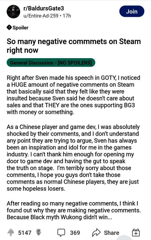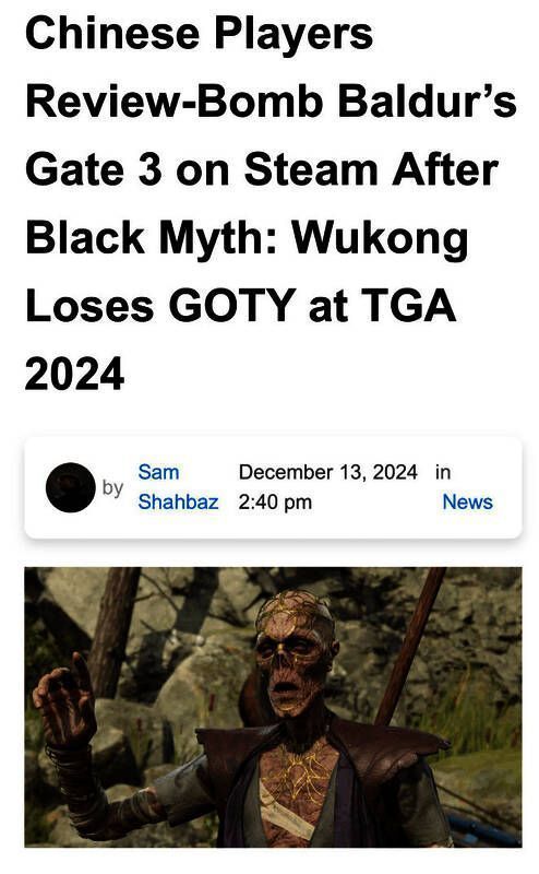 玩家以为,拉瑞安总监的发言就差那么一点没有明说国内3A游戏《黑神话:悟空》,纷纷跑到《博德之门3》Steam页面,批评拉瑞安被当枪使,后悔真不应该在拉瑞安困难时支持。