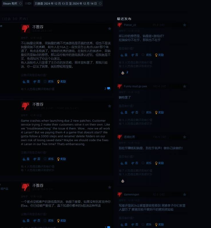 Steam页面上的评测柱状图显示在12月13日TGA颁奖礼举办当天,《博德之门3》突然被差评轰炸,13日当天共留下了542个差评,到了12月14日今天,情况有些好转,打差评情况有所缓和,但还是有将近100个差评(92个)。