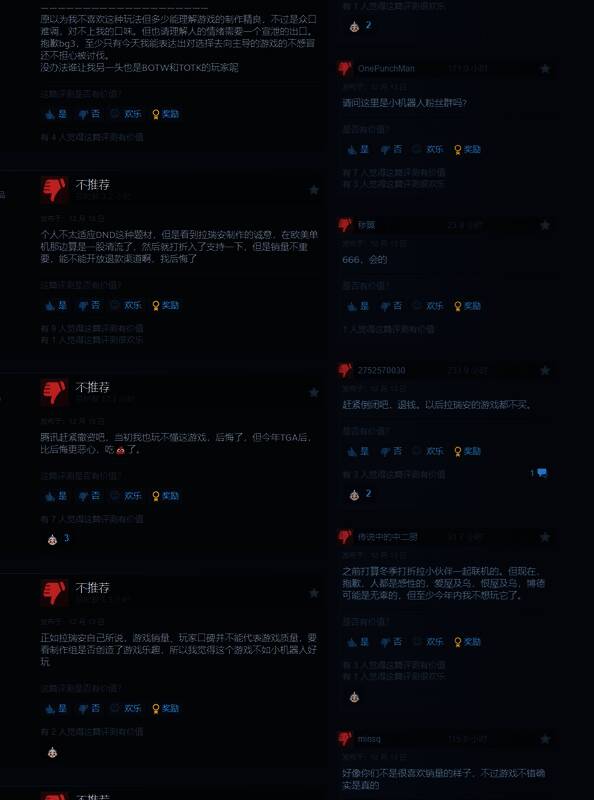 国内玩家差评《博德之门3》主要是因为拉瑞安总监Sven在上台颁发年度游戏时的发言,国内玩家认为他的发言似乎暗示一款游戏能否应得年度游戏不应按照销量,高销量的游戏并不代表游戏就优秀,销量其实没那么重要。