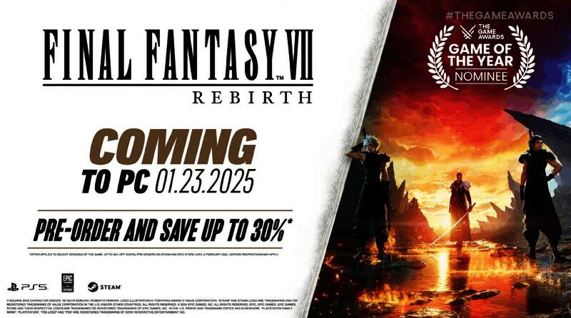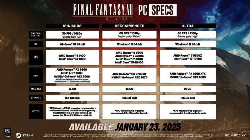 今日TGA颁奖典礼上,SE宣布《最终幻想7:重生》PC版将于2025年1月23日发售。随后官方公布了游戏PC配置需求,一起来看看吧!