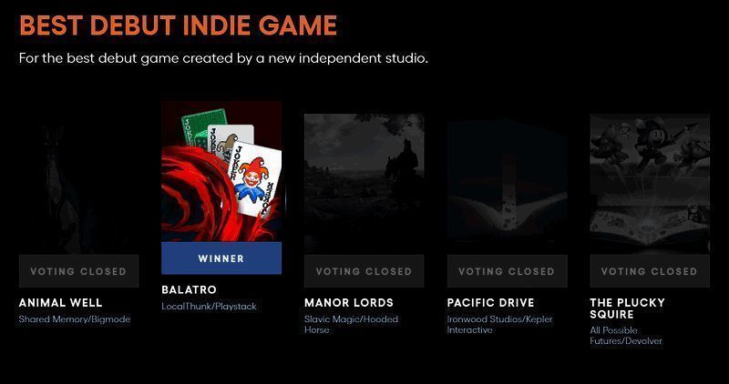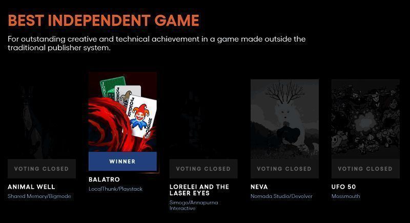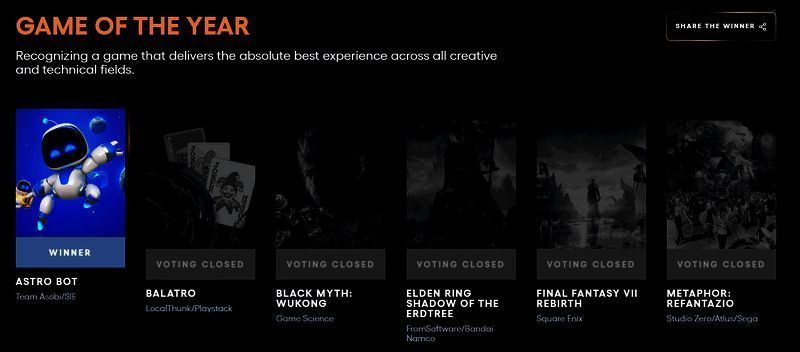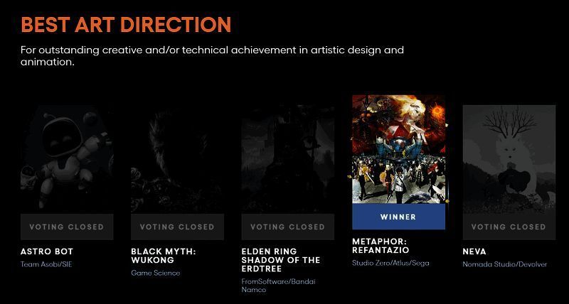 其他提名:《小丑牌》《黑神话:悟空》《艾尔登法环:黄金树幽影》《最终幻想7:重生》《暗喻幻想:ReFatazio》