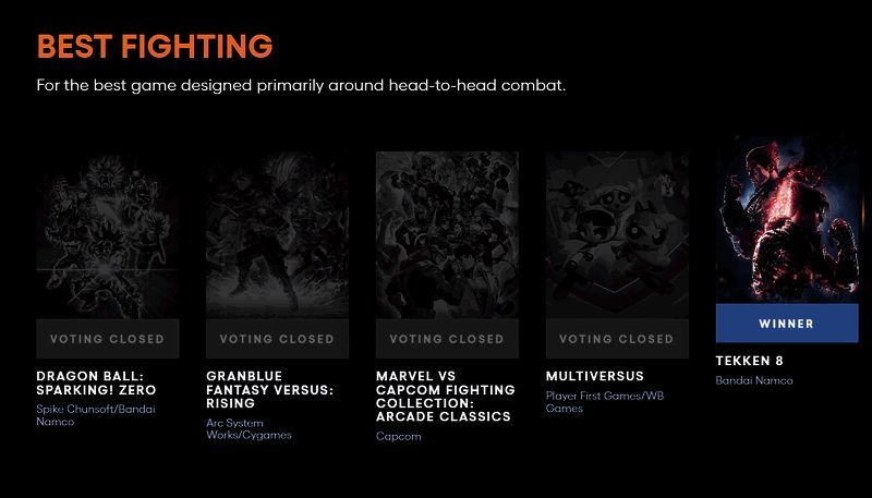 其他提名:《七龙珠 电光炸裂!ZERO》《碧蓝幻想Versus:崛起》《漫威vs.卡普空格斗:经典街机合集》《华纳大乱斗》