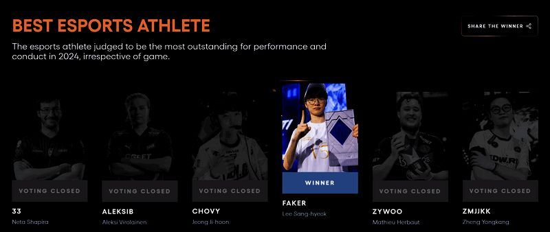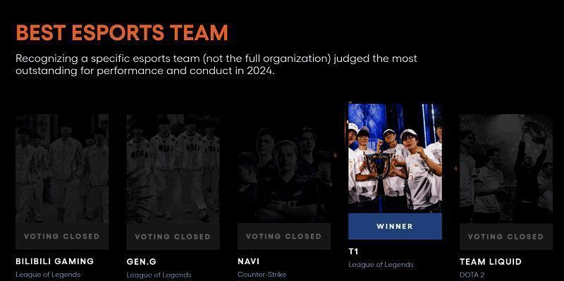 其他提名:Bilibili Gaming《英雄联盟》、Gen.G《英雄联盟》、Navi《CS2》、Team Liquid《DOTA2》